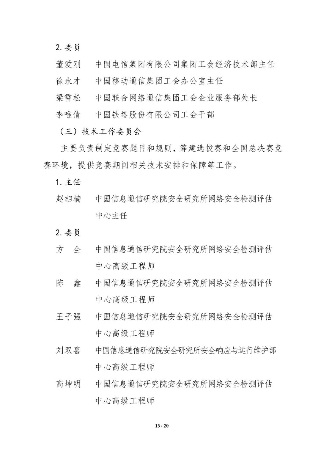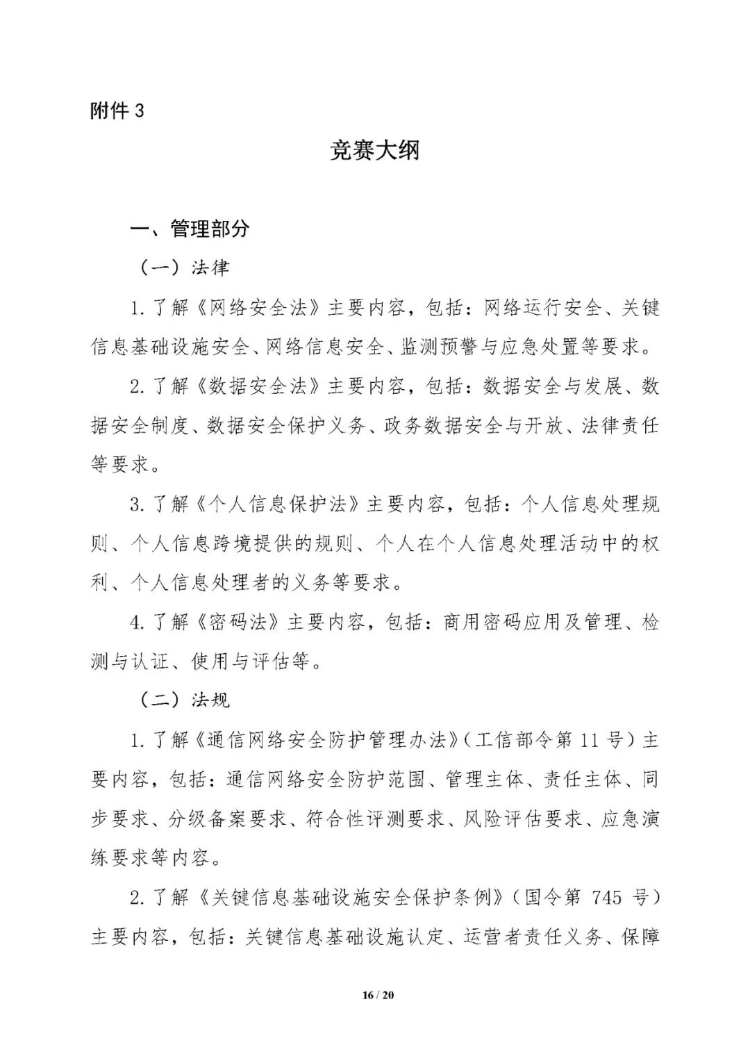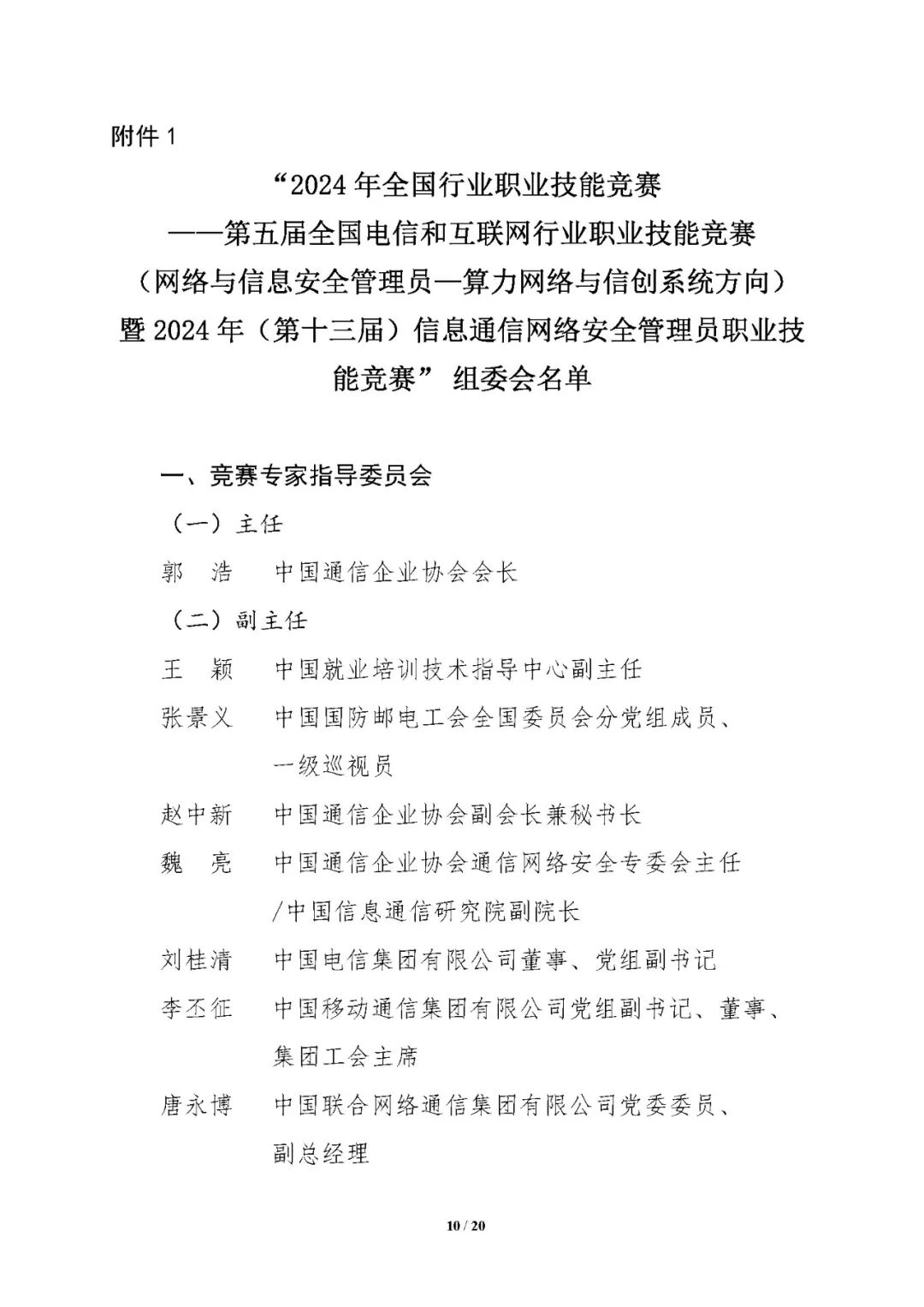 为全面贯彻落实党的二十大精神和习近平总书记关于技能人才工作和职业技能竞赛工作的重要指示批示精神,大力弘扬劳模精神、劳动精神、工匠精神,有效促进基础电信运营企业强化自身网络安全人才培养,加快推动电信和互联网行业网络安全高技能人才队伍发展壮大,全面加强网络安全保障体系和能力建设,根据《人力资源社会保障部关于组织开展2024年全国行业职业技能竞赛的通知》(人社部函〔2024〕41号)和《关于举办2024年全国行业职业技能竞赛——第五届全国电信和互联网行业职业技能竞赛的通知》(通企〔2024〕168号)等相关要求,中国通信企业协会、中国就业培训技术指导中心、中国国防邮电工会全国委员会决定联合举办“2024年全国行业职业技能竞赛——第五届全国电信和互联网行业职业技能竞赛(网络与信息安全管理员—算力网络与信创系统方向)暨2024年(第十三届)信息通信网络安全管理员职业技能竞赛”(以下简称“竞赛”),由中国通信企业协会通信网络安全专业委员会负责承办。现将有关事项通知如下:本次竞赛是经人力资源和社会保障部批准的国家二类职业技能竞赛,为保证竞赛活动组织有序,大赛方式公平公正,竞赛专门成立专家指导委员会和竞赛组委会(名单详见附件1)。竞赛专家指导委员会主要负责指导统筹和部署推动赛事各项重点工作,加强对竞赛活动的宏观性、战略性指导,由竞赛主办单位与基础电信运营企业等单位的相关领导、专家组成。竞赛组委会是竞赛最高领导决策机构,主要负责统筹协调竞赛各项工作推进实施与组织管理工作。竞赛组委会下设办公室、监审委员会、技术工作委员会,负责具体落实赛事组织实施、研究审定竞赛方案、协调决策竞赛重大事项、指导监督竞赛开展全过程、发布竞赛结果等相关事宜。竞赛工种(赛项):4-04-04-02网络与信息安全管理员(算力网络与信创系统方向)(一)职工组:从事网络与信息安全管理等相关专业或职业的在职职工,各类高等院校和职业院校(含技工院校、高职高专、中职等,下同)从事网络与信息安全管理等相关专业工作的在职教师。(二)学生组:各类高等院校和职业院校全日制在籍学生。(一)竞赛内容:以理论考试和技能操作相结合,综合考查参赛选手的网络安全理论基础和实践技能。重点考查参赛选手在网络安全管理、网络安全技术、系统安全技术、应用安全技术等领域的理论基础知识,以及网络安全相关法律法规等关键内容。根据电信和互联网行业实际网络业务情况,并结合近期常见的网络安全问题,围绕算力网络、信创系统、关键信息基础设施等重点应用方向,构建基础电信运营企业典型业务场景和5G网络、云计算、大数据、人工智能等新技术方向电信各业务场景等竞赛环境,涉及典型攻击防护、威胁分析、安全加固、应急响应等方面,综合考查参赛选手在各项安全技能掌握水平,助力筑牢电信和互联网网络安全防护屏障。(二)竞赛命题标准:由理论考试和技能操作两部分组成,按照《网络与信息安全管理员国家职业标准(2020年版)》高级工以上技能要求实施,总成绩中理论考试成绩占20%、实际操作成绩占80%。竞赛将积极吸收与借鉴国内外职业技能大赛命题方法和考核内容,适当增加相关新知识、新技术、新技能内容,同时结合企业职业岗位对人才培养需求,并参照相关国家职业标准制定。(见附件3《竞赛大纲》)1.省级选拔赛:以各省、直辖市、自治区为单位组织省级选拔赛,由省通信管理局会同其他相关部门及信息通信行业协会立足区域优势,科学制定竞赛工作方案,加强竞赛活动组织和选拔力度,选拔范围应全面覆盖本省份的基础电信运营企业、网络安全企业、互联网企业、研究机构和相关高等院校、职业院校等相关单位。在2024年实际组织开展省级选拔赛的省份可推荐2名优秀个人选手和1支优秀参赛队伍分别参加全国总决赛的个人赛和团队赛。2.基础电信运营企业集团选拔赛:由基础电信运营企业集团公司(主要为中国电信、中国移动、中国联通、中国广电、中国铁塔)自行组织开展集团选拔赛,选拔范围应全面覆盖所属各省公司、地市公司和专业公司。各基础电信运营企业集团根据选拔赛成绩择优推荐相关优秀个人选手和优秀参赛队伍分别参加全国总决赛的个人赛和团队赛。(二)全国总决赛阶段:2024年11月30日前完成由竞赛组委会统一组织全国总决赛。比赛形式包含安全卫士个人赛、安全卫士团队赛,其中:安全卫士个人赛:通过理论解题和夺旗赛模式,在考查参赛选手在网络安全管理、网络安全技术、系统安全技术、应用安全技术等领域的理论和实践技能基础上,设定算力、信创、关基等领域 信息系统及安全事件仿真场景,考察选手面向实战的情报技术、渗透技术、持久化机制技术、横向移动技术、命令控制、威胁检测,以及多层监测、检测、防御、溯源和应急处置等综合技战能力。安全卫士团队赛:团队赛分为网络攻防对抗赛、应急响应挑战赛和漏洞挖掘挑战赛三个赛道。各赛道采用独立计分方式,围绕算力网络、信创系统、关键信息基础设施、开源软件等重点领域,构建网络攻防场景、应急处置场景和漏洞挖掘场景。网络攻防对抗赛参考典型安全事件及技战术,采用互攻互防、动态防御和安全加固的形式开展;应急响应挑战赛基于典型事件、活跃APT组织攻